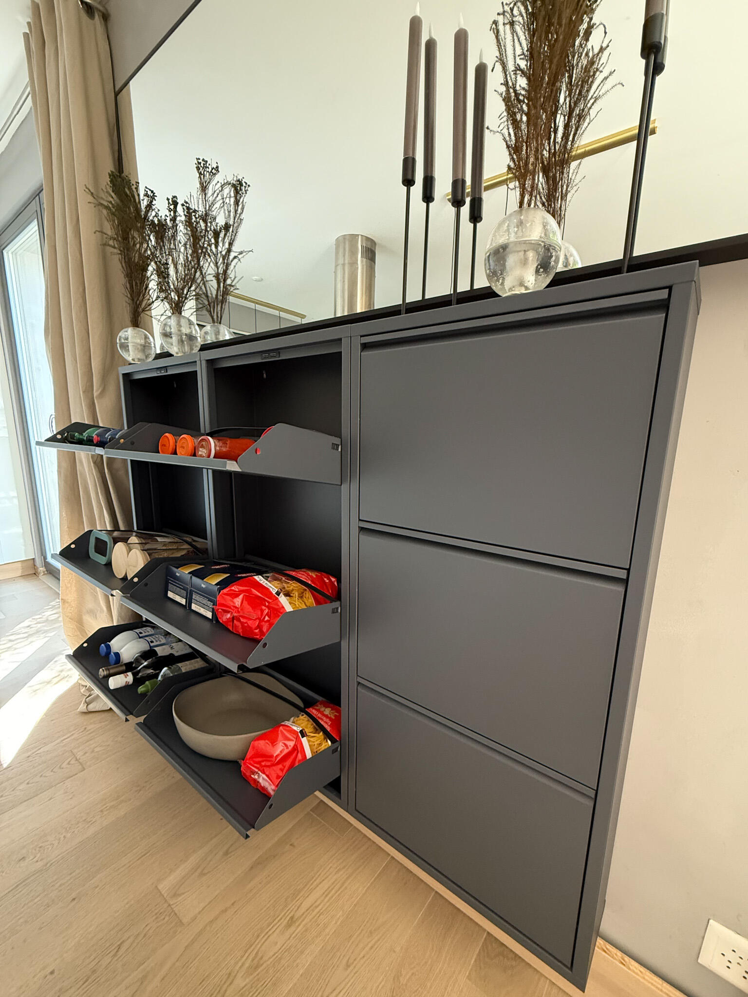 Un meuble à chaussures détourné pour stocker pâtes, gourdes, conserves, bouteilles, etc.